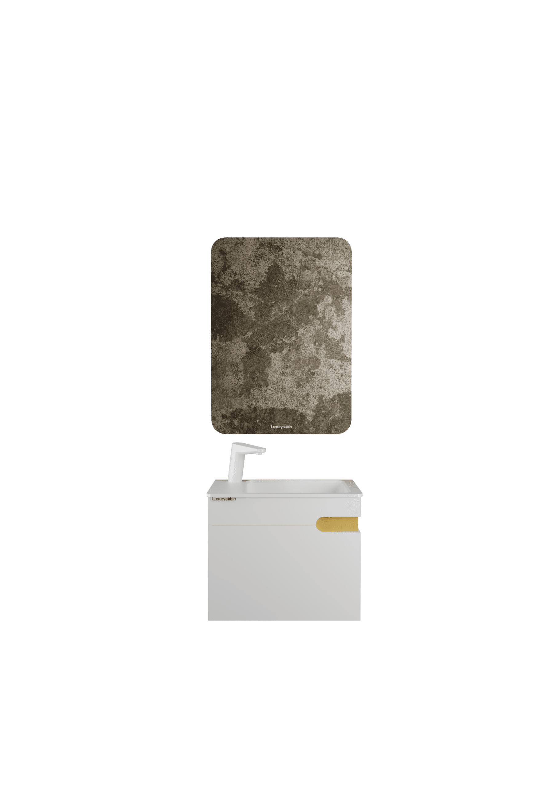 این روشویی لاکچری کوچک سفید طلایی از PVC ضد آب و مقاوم در برابر رطوبت ساخته شده است تا در محیطهای مرطوب سرویس بهداشتی، دوام بالایی داشته باشد. صفحه رویی آن از پرسلان یا کورین مرغوب ساخته شده که در برابر خراش، لکه و حرارت مقاوم است.